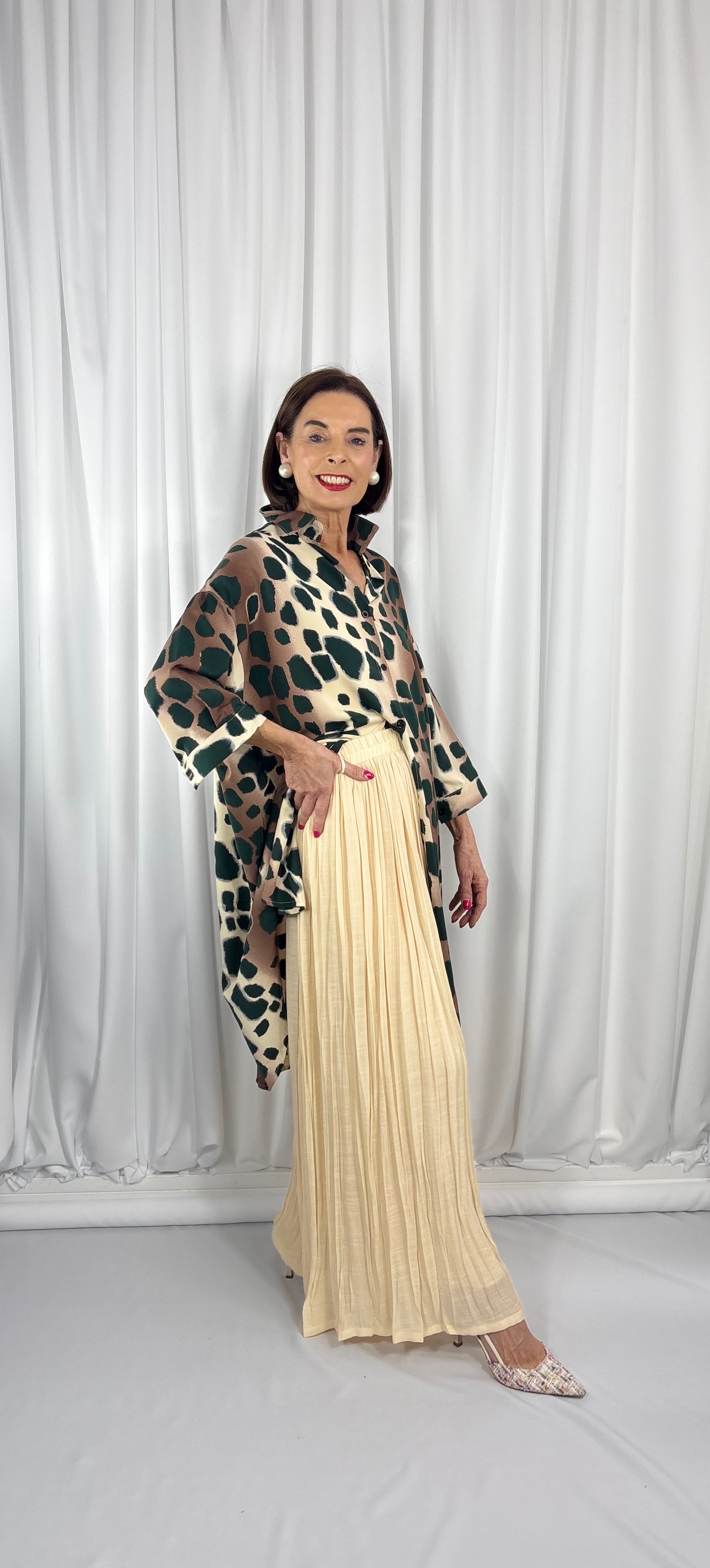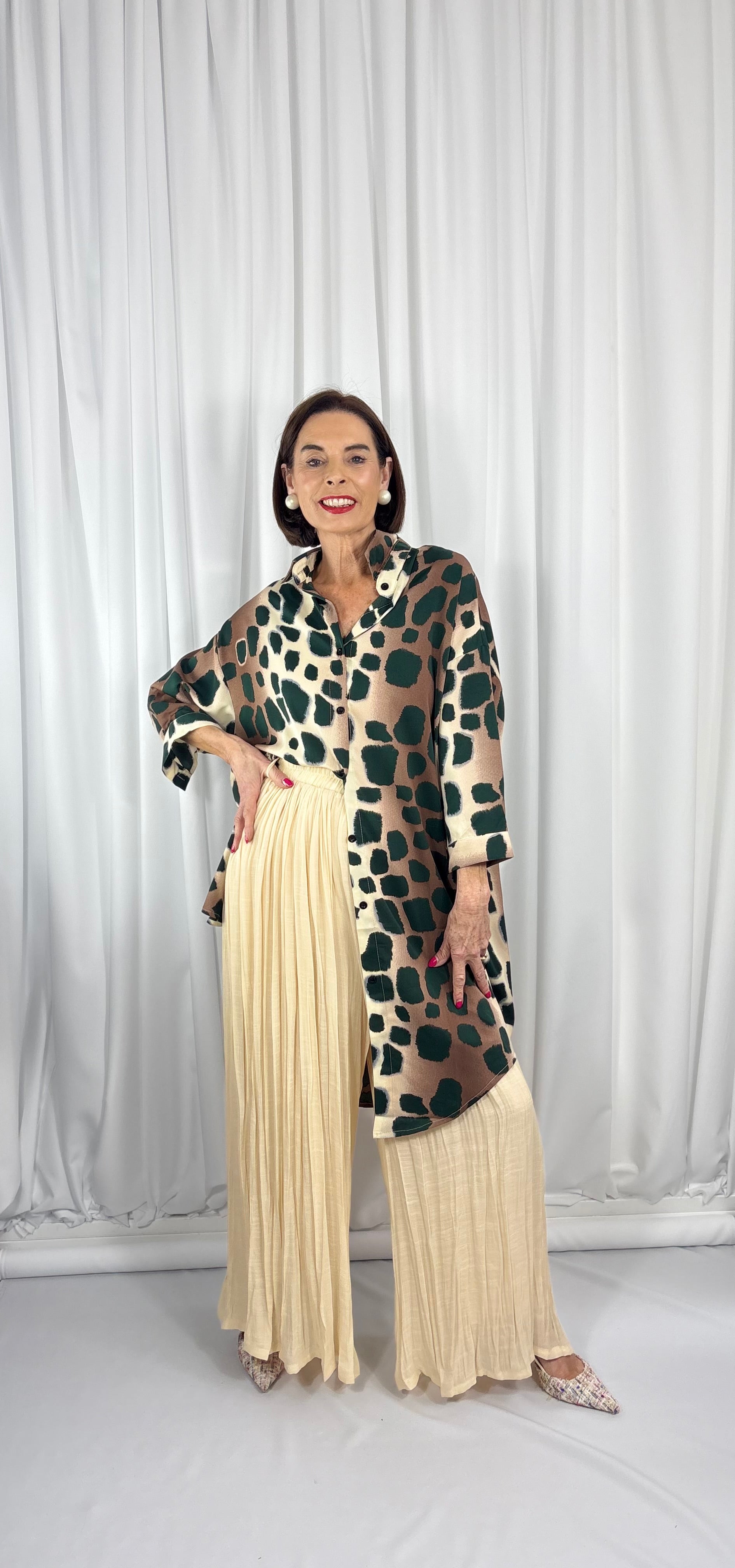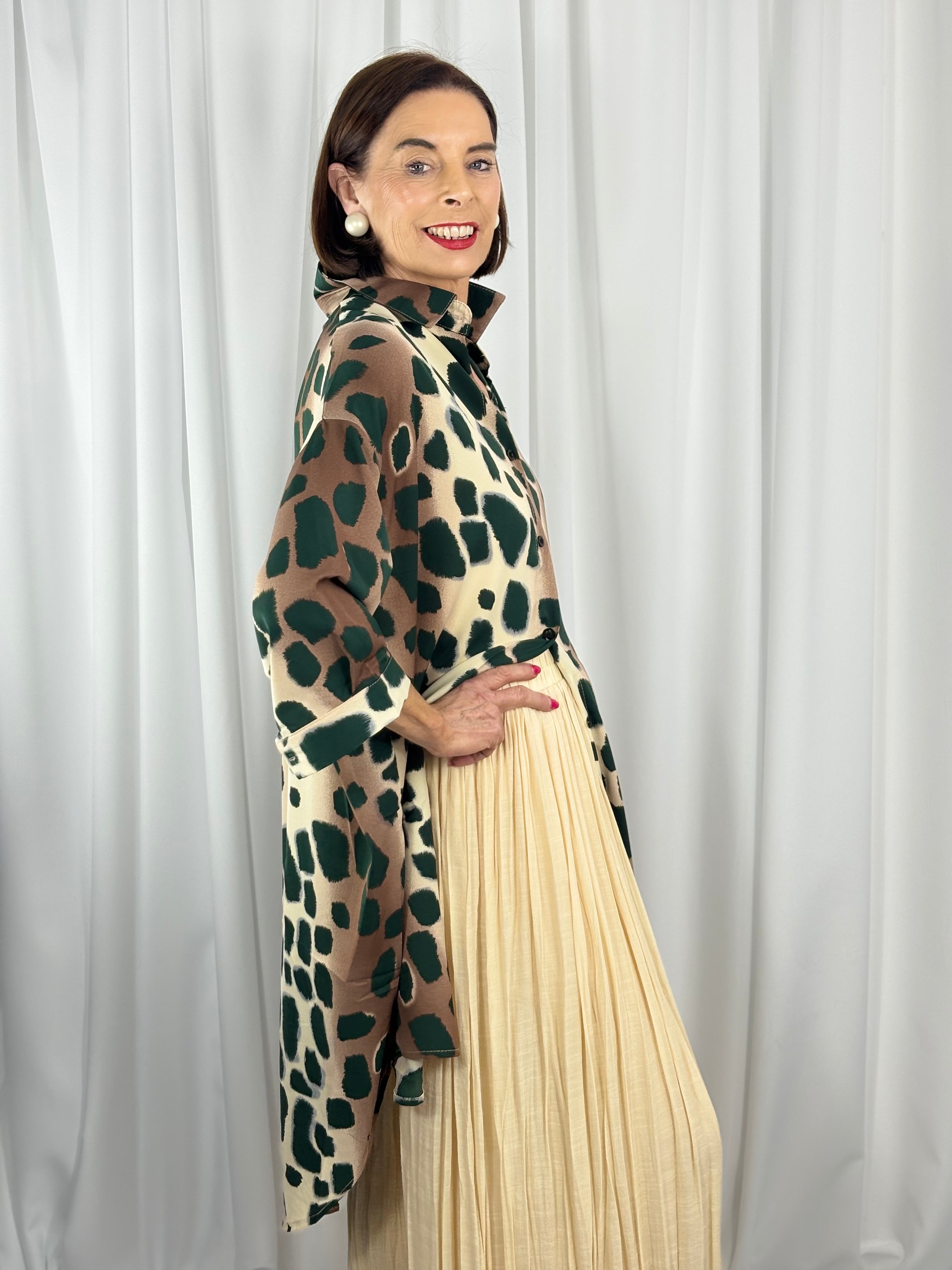 This is a long, oversized button-down tunic top featuring a bold, abstract animal-print design. The print consists of large, irregular black brushstroke spots on a gradient background that shifts from beige to ivory. The top has a classic shirt collar, dropped shoulders, and wide three-quarter sleeves that give it a relaxed, flowy silhouette. The hemline is asymmetrical and drapes loosely, making it versatile for both casual and chic styling.