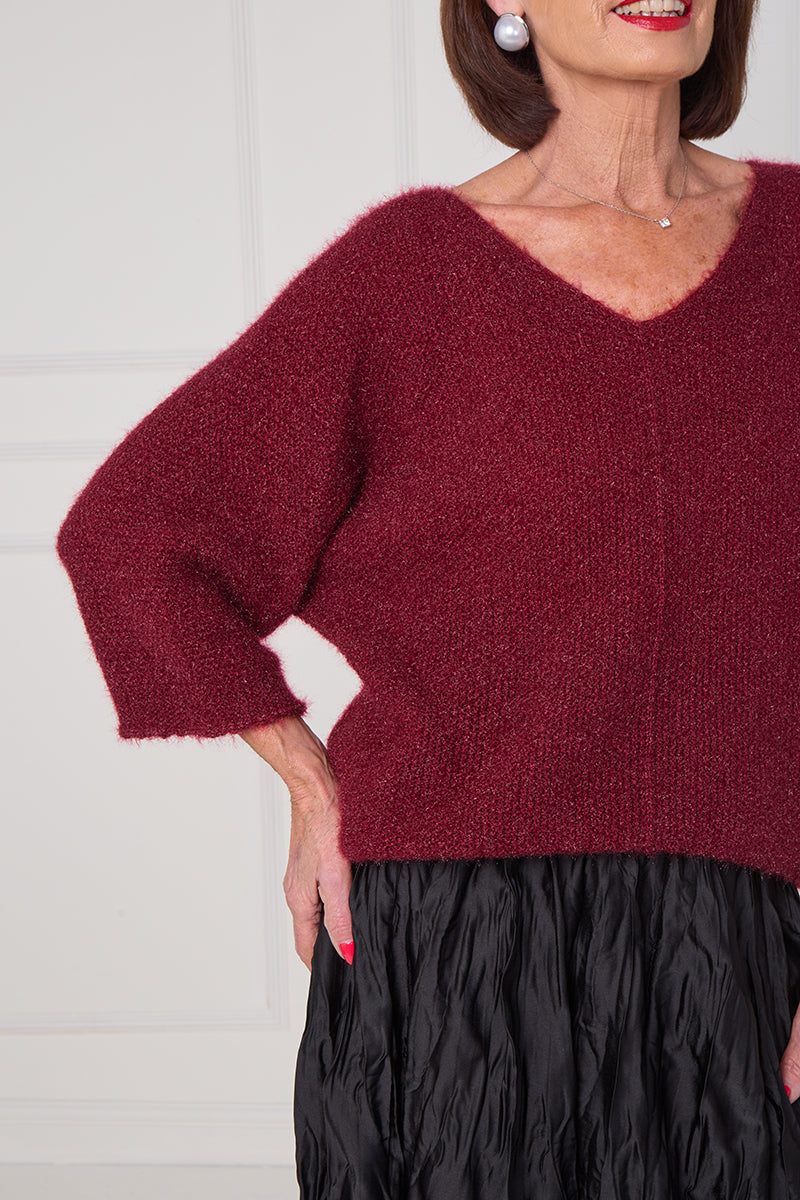 The knitwear shown in the image is a loose, soft-textured sweater featuring a relaxed, oversized fit with dropped shoulders and a slightly wide neckline. Its design offers a cozy and elegant look, pairing well with both casual and more refined outfits. The garment has a comfortable drape that enhances movement and ease of wear, making it a versatile piece for layering or standalone styling.