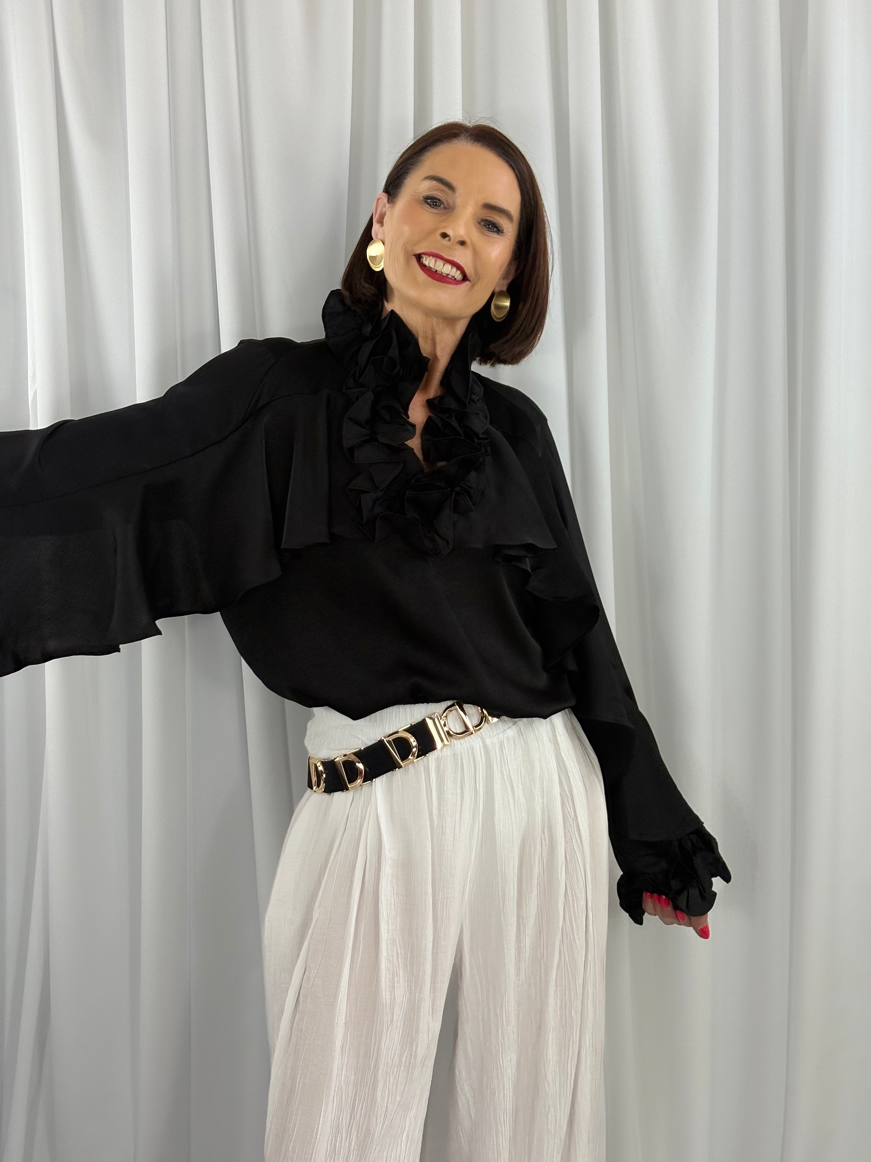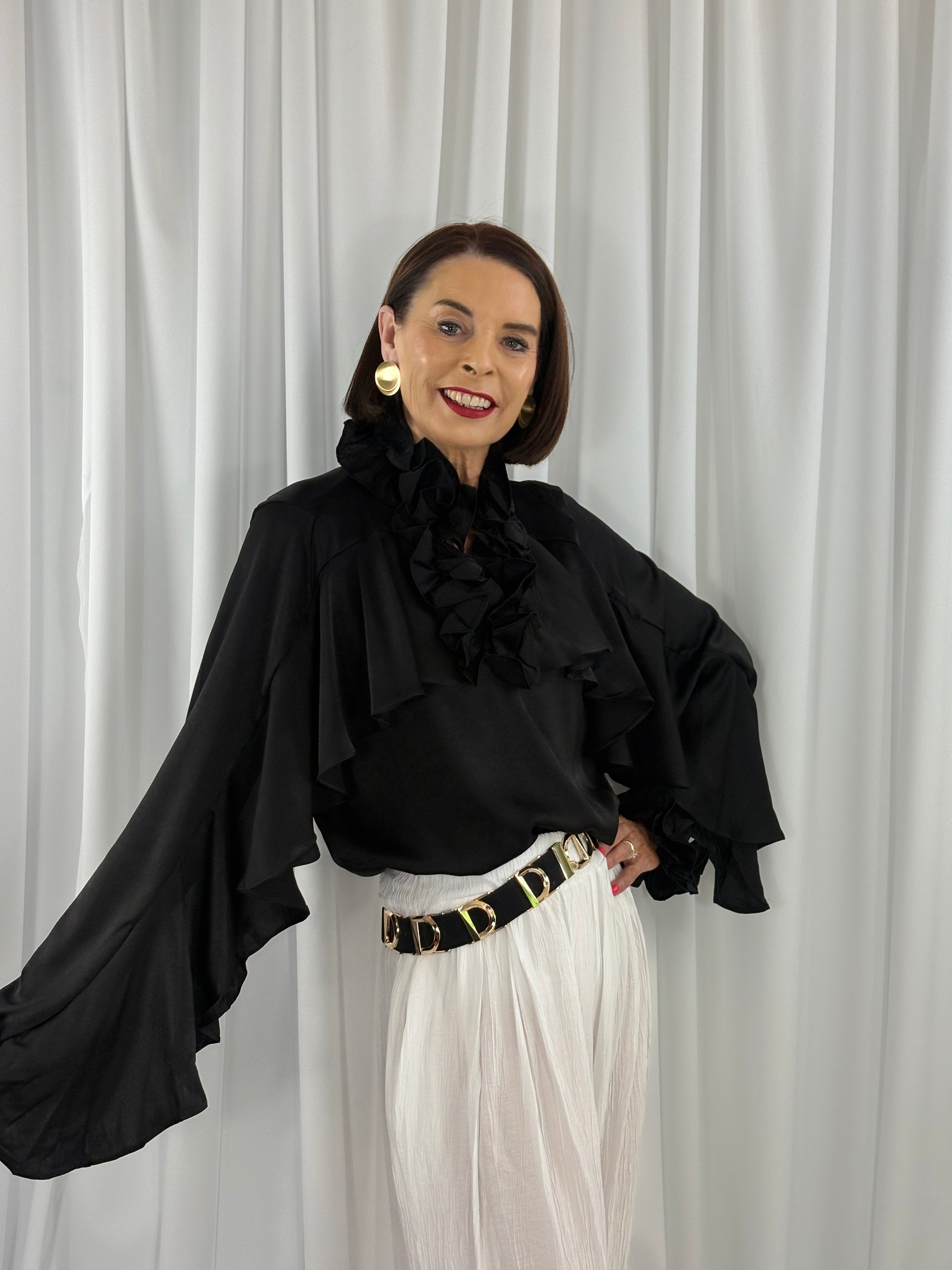 - Ruffled high neckline and front for added detail