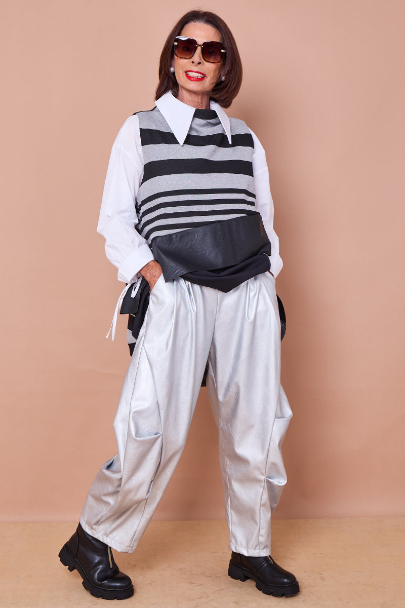 This unique, contemporary waterfall top blends different textures and design elements for a striking look. The top layer is a cozy cowl neck knit featuring bold horizontal stripes. Beneath the knit section, a structured black faux leather (PU) panel is incorporated, giving the top a modern, edgy feel. This faux leather section extends to create a distinctive asymmetrical waterfall hem detail. Function meets fashion with a prominent working silver zipper