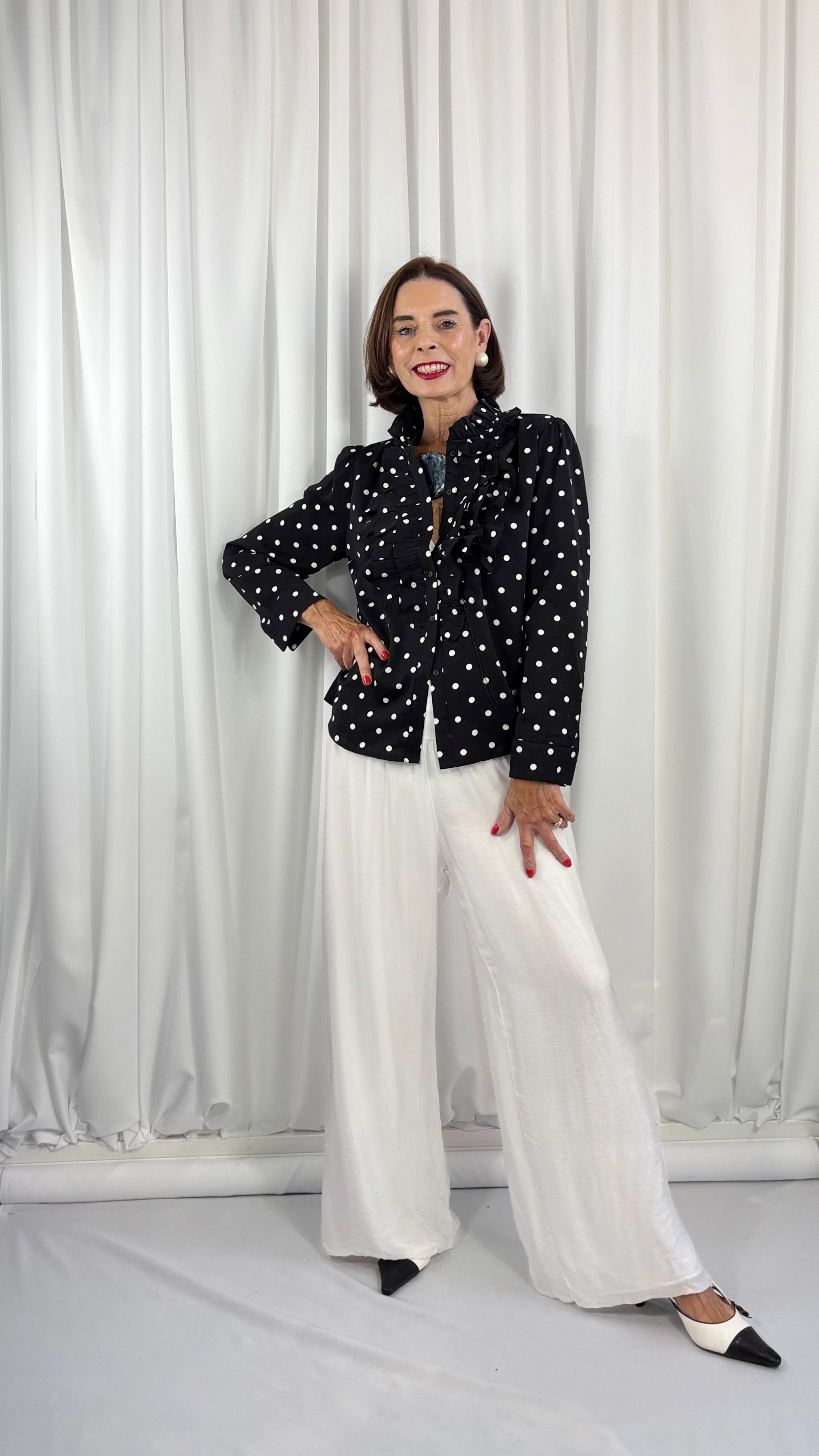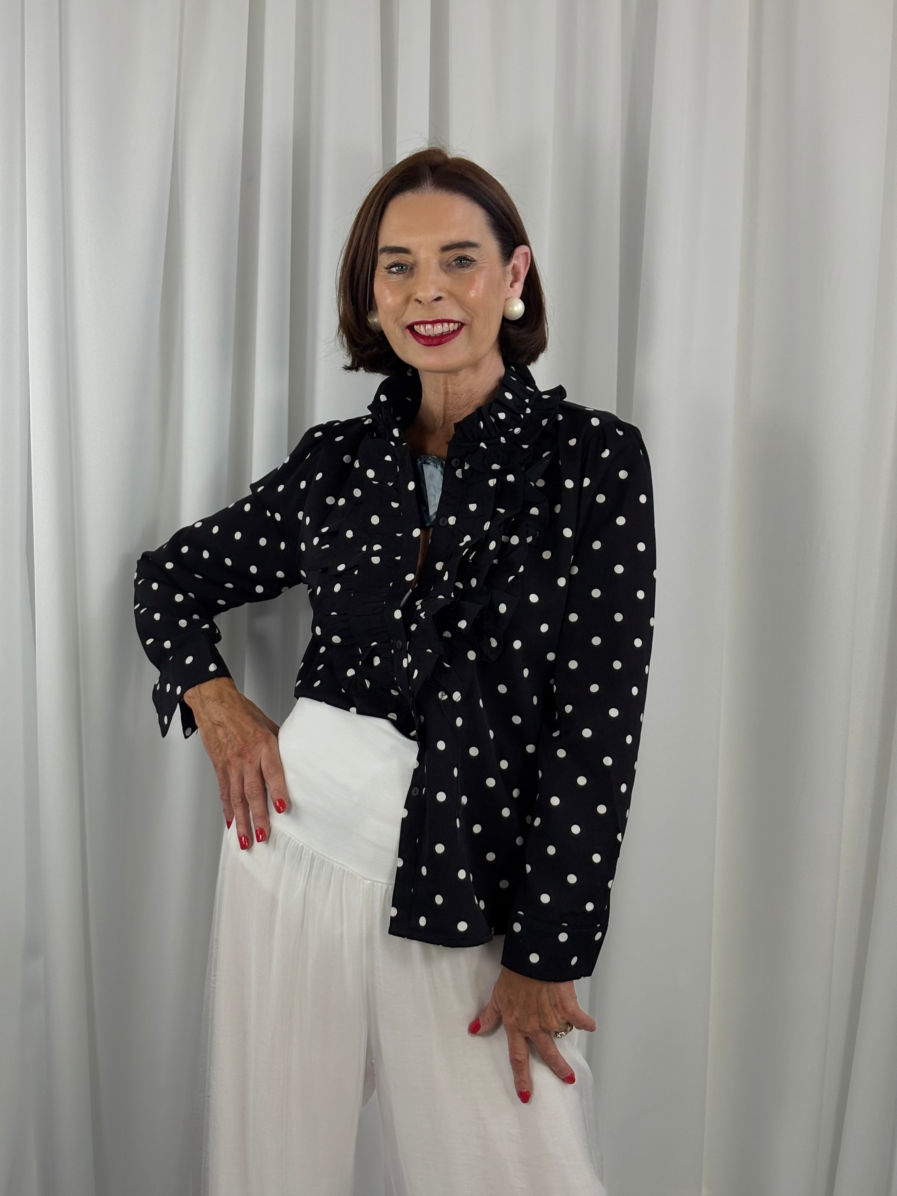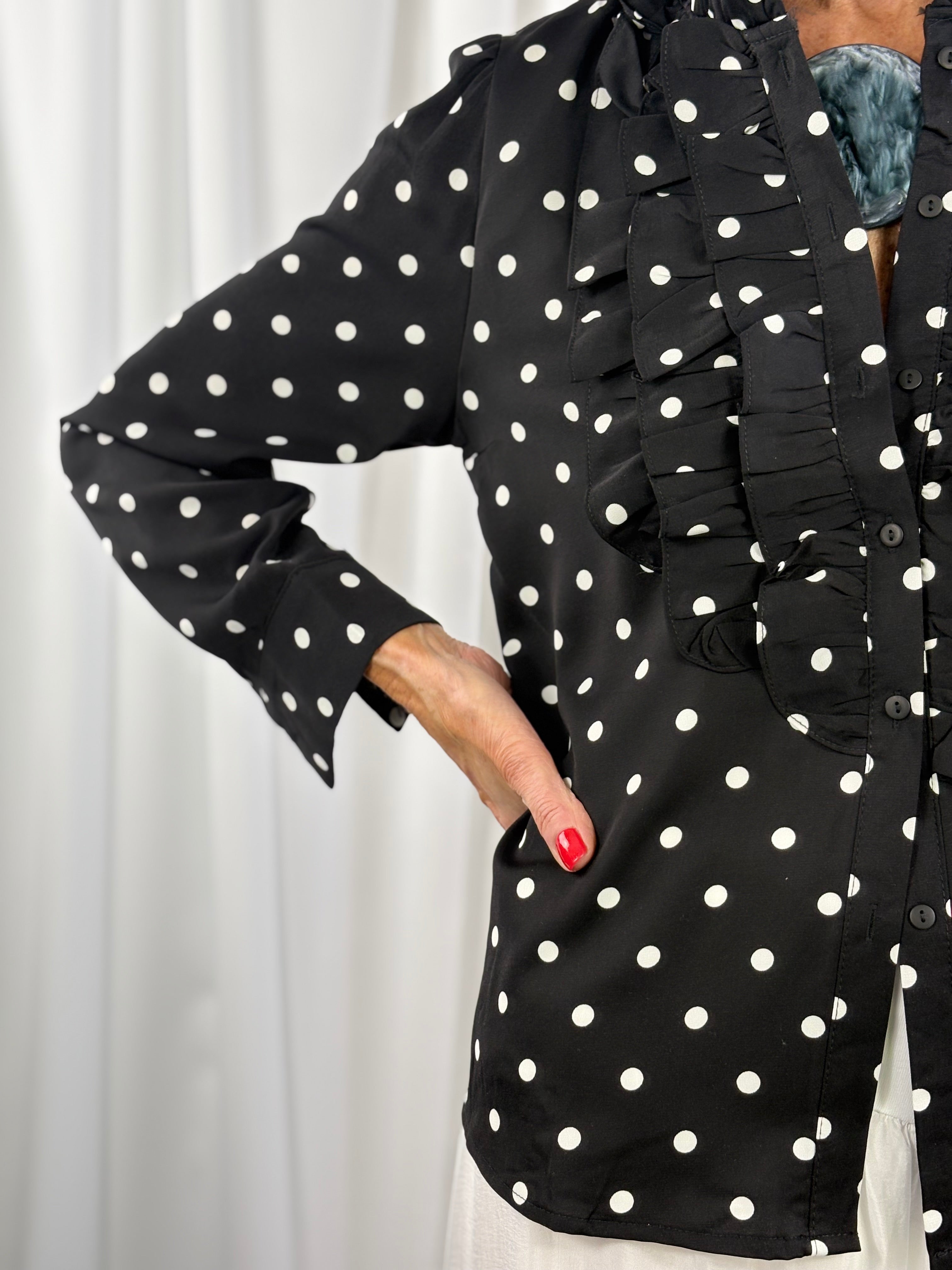 Polka dot shirt with a timeless, feminine design. Features a high ruffled collar and cascading front ruffle detail. Button-down style with elegant, vintage-inspired charm. Long sleeves with tailored cuffs for a polished finish. Lightweight fabric that drapes beautifully for versatile styling.