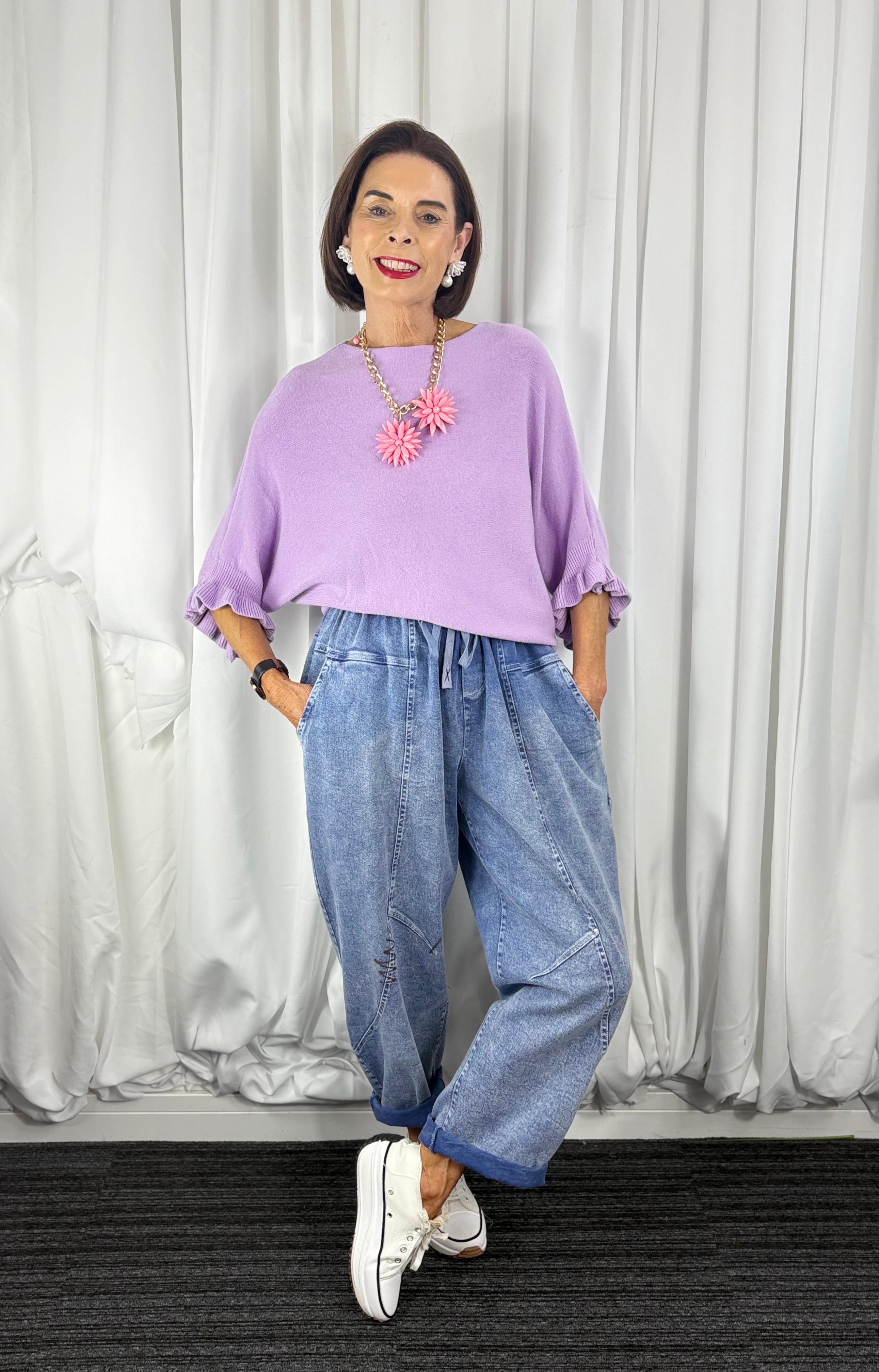 These jeans showcase a trendy, voluminous barrel or curved-leg silhouette, offering a relaxed and modern fit. They are crafted from a light to medium wash denim with an intentionally distressed, washed appearance and feature prominent contrast stitching that highlights the architectural panel construction. The style is casual and comfortable, featuring a drawstring elasticated waist for ease of wear, and importantly, includes two functional side pockets for practicality.